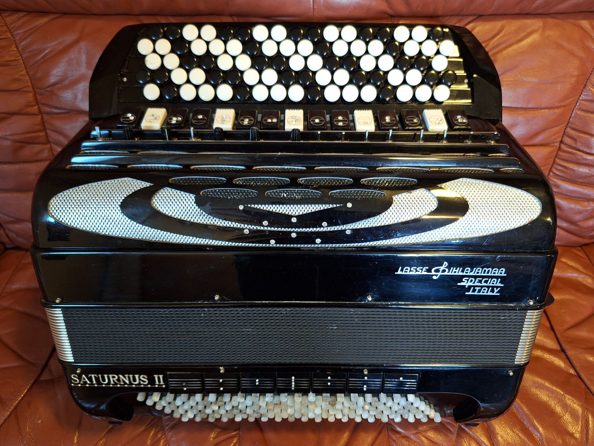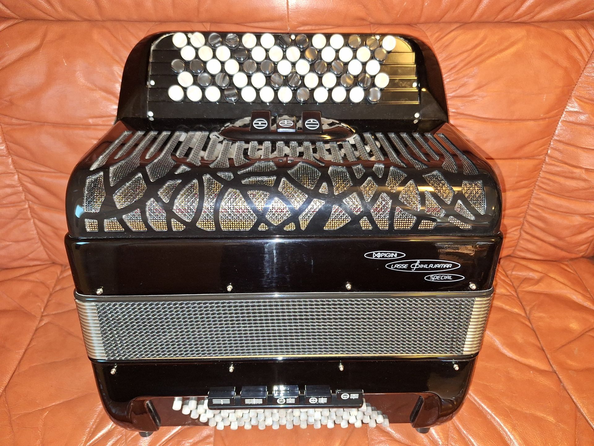 Lasse Pihlajamaan 2 äk melodiabassoharmonikka vuodelta 2021. Palkeen korkeus 37cm ja soivia diskanttiäänia 36, paino 8,5 kg. Melodiabassoääniä on 37 kpl, bassonappuloita 78 kpl. Pigini