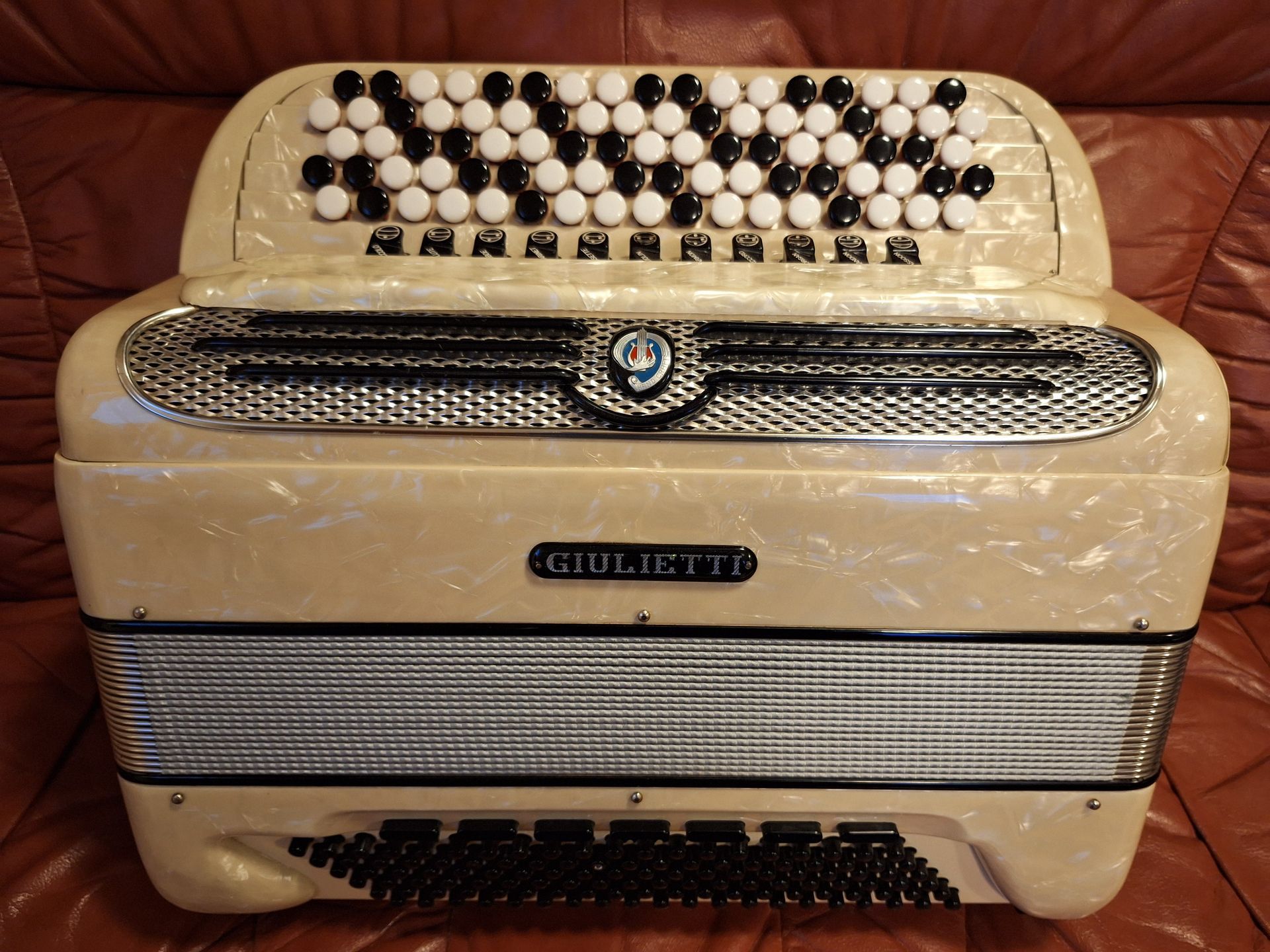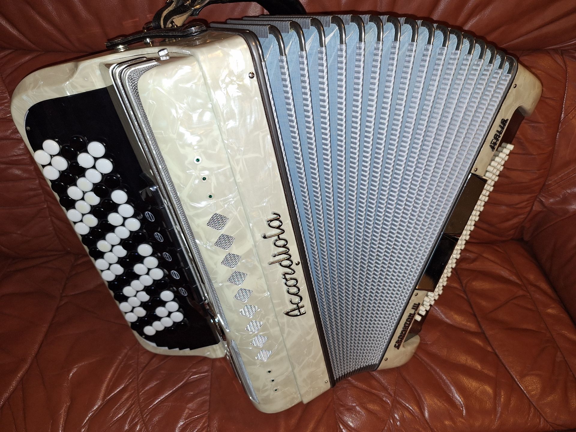 Tämä hienosointinen valkoinen casotto harmonikka on vuodelta 1990.