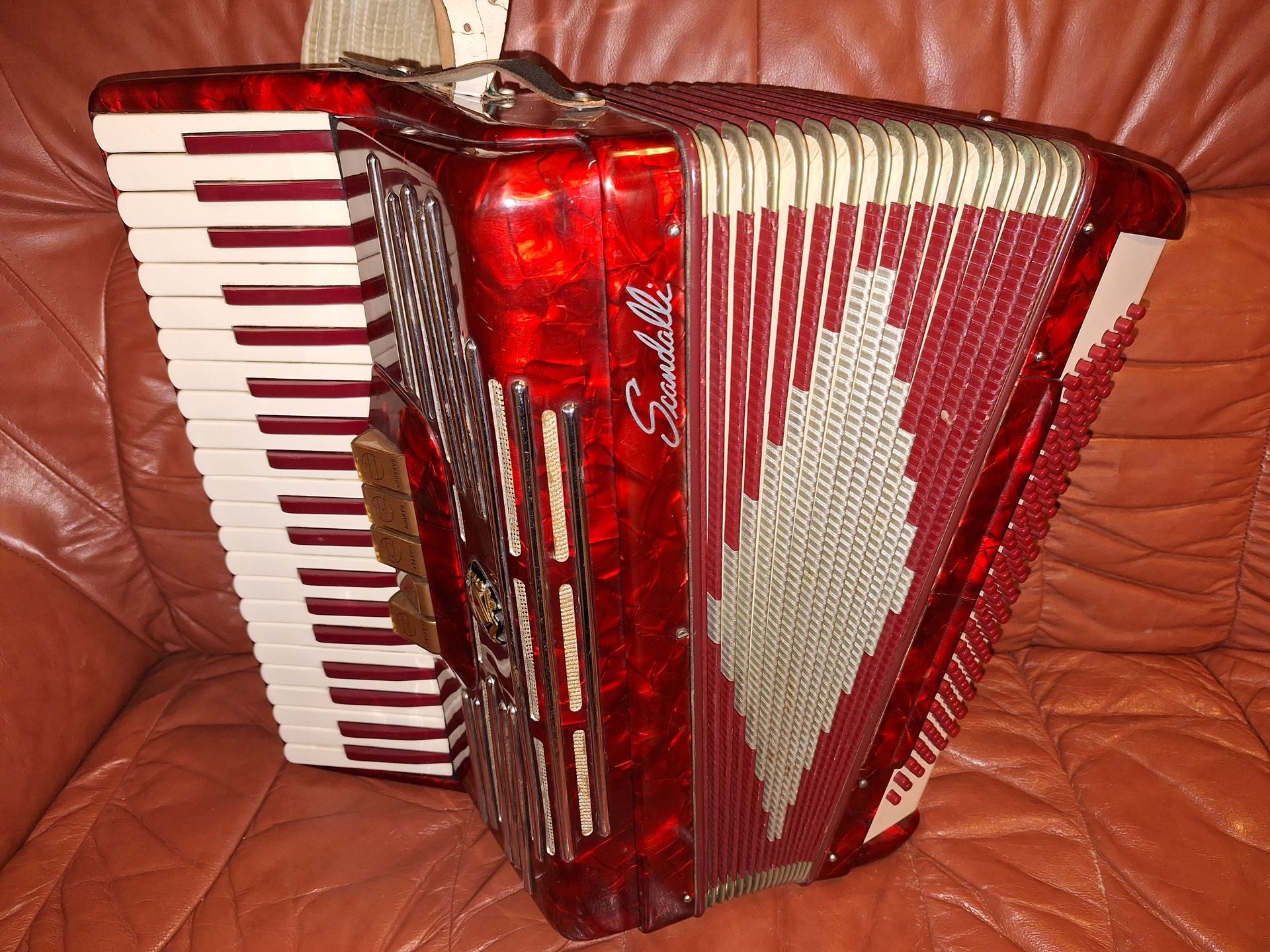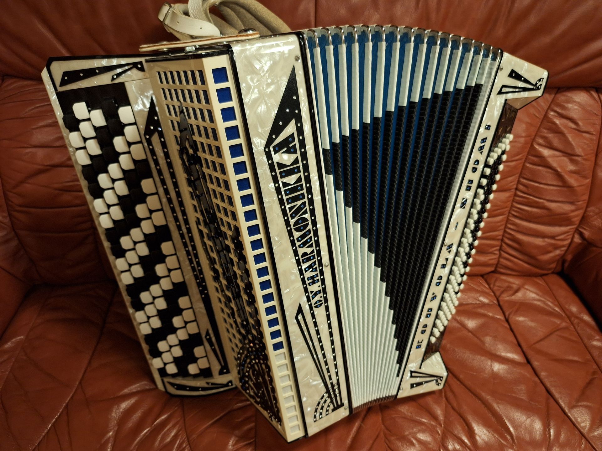 Tässä kaunis haitari hyvillä valssiäänillä. Harmonikassa on kolme äänikertaa! Paino noin 9 kg, palkeen korkeus vain 43 cm!