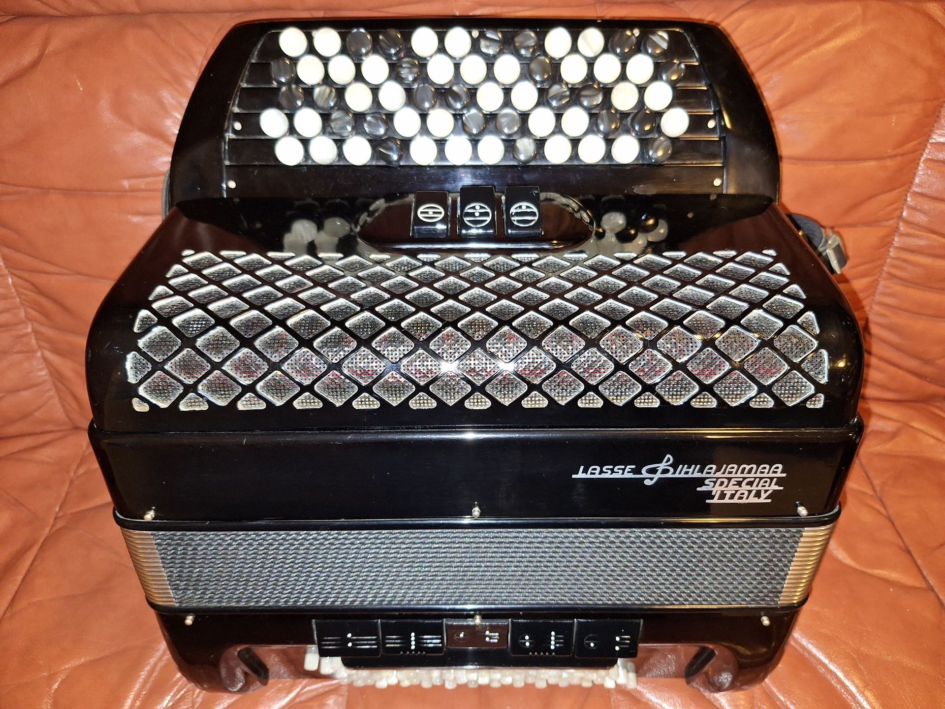 Lasse Pihlajamaa melodiabasso harmonikka . 37 soivaa diskanttiääntä ja 37 melodiabassoääntä.